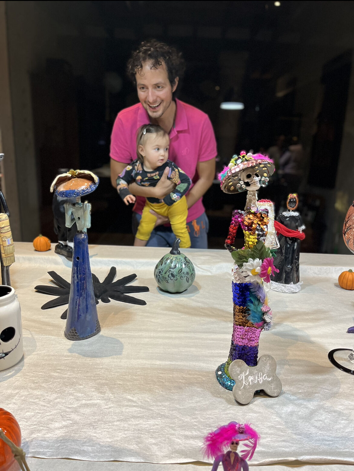 Byli jsme se podívat i u našich sousedů v Tequisu. Mají také obří dům s obřím sklepem, který využívají jako hernu, bar, pracovnu a TV room. K oslavě Halloweenu tam měli výstavku Catrinas – barevné, nazdobené kostřičky, které vypadají jako z filmu od Tima Burtona. Vane se hystericky rozbrečela u jednoho mluvícího kostlivce v životní velikosti. A jako já bych asi taky měla co dělat, kdybych tam šla sama – myslela bych si, že zpátky živá nevyjdu. Už se těším, jakou výzdobu připraví na Vánoce :-).