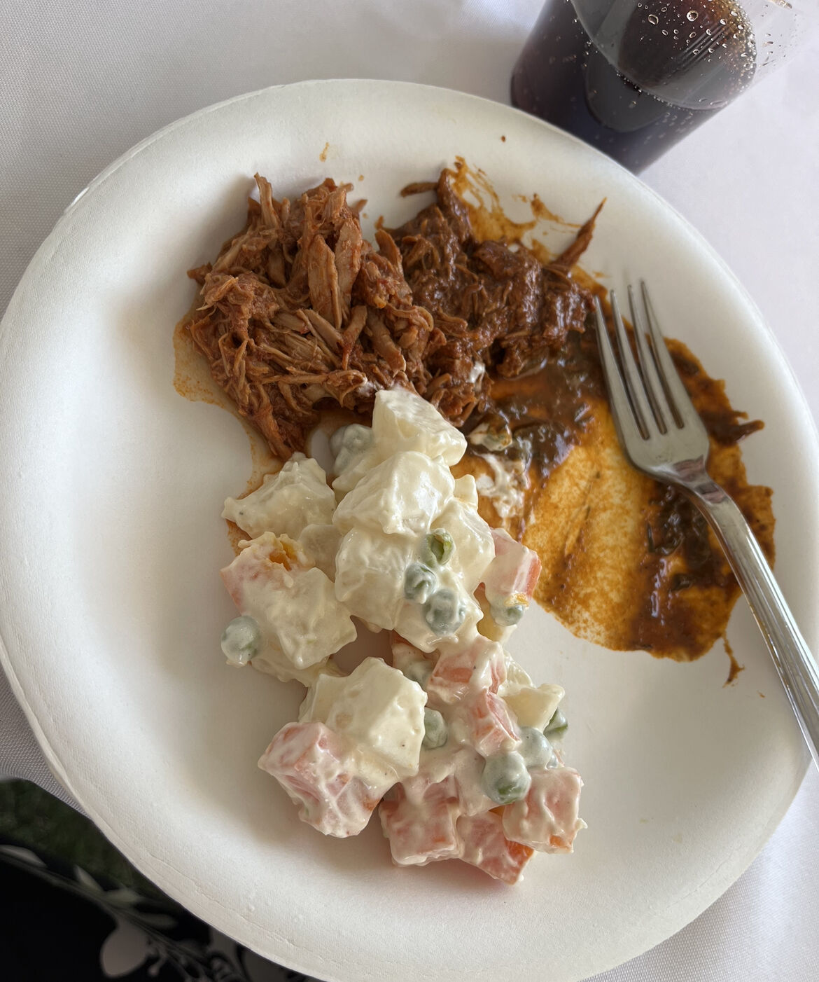 Na posadu jsme naštěstí nevařili my, ale objednali catering u mamky pantátova spolužáka ze střední. Všechno bylo naprosto luxusní. Měli jsme dokonce i bramborový salát. Pak Romelitos, které se prý jí tradičně na Vánoce. Je to mix kakaového omáčky mole, nopales (rozblemcaný kaktus) a rozmarýnu. Z nopales mi natahuje, jen co ho vidím, ale tady byl tak dobře rozvařený, že jsem si ho ani nevšimla a sežrala to na posezení.