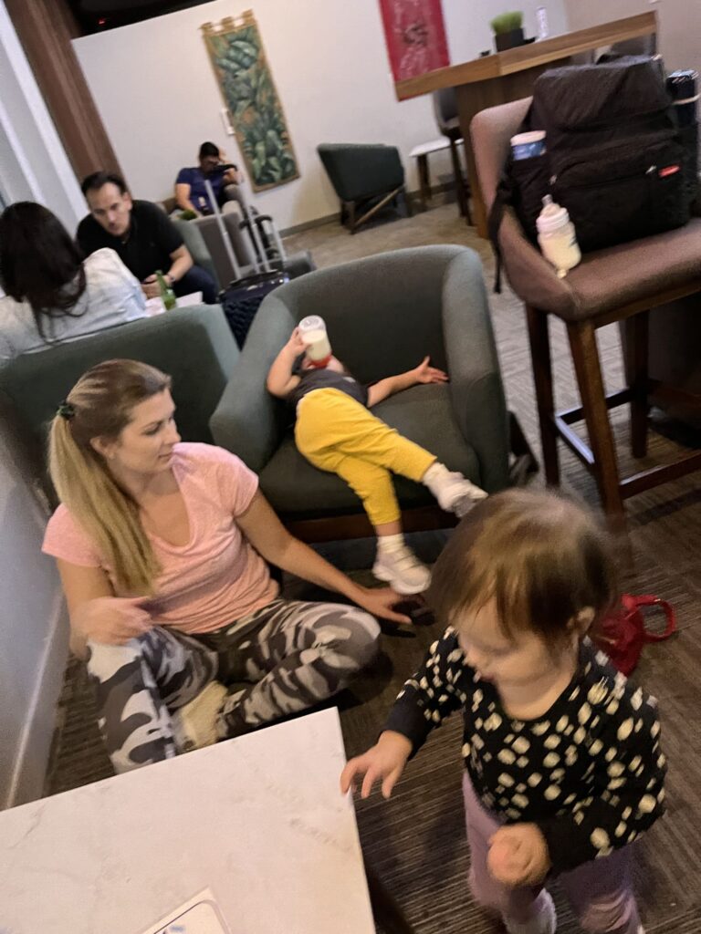 Pak jsme hledali lounge, ve které bysme zakempili díky pantátově kartě. Vyšel nám až asi čtvrtý pokus. Bylo to naše útočiště na další 3h. Vzali jsme si křesílka a udělali si tam provizorní dětský koutek. Dali jsme si jídlo, provedli hygienu a kolem 9h večer se odebrali ke gatu.